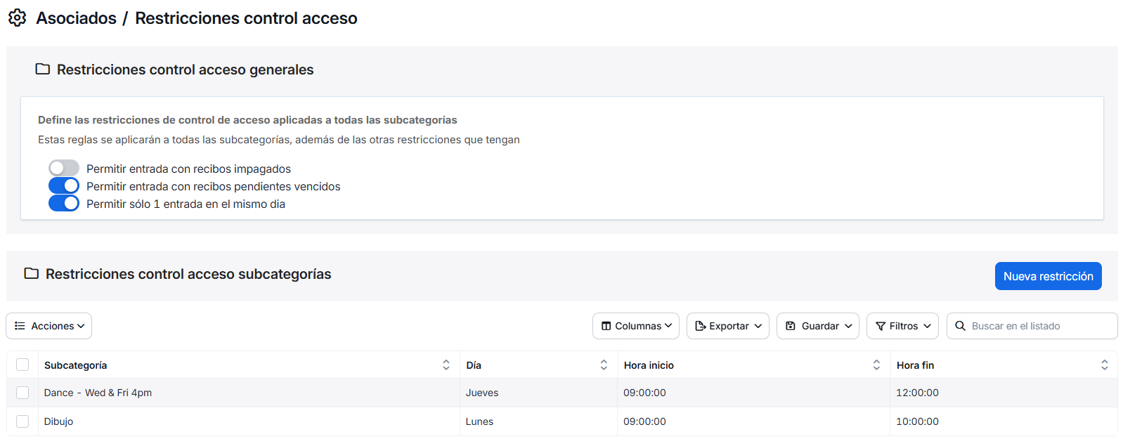 - Recibos impagados: Impide la entrada si existen deudas pendientes.