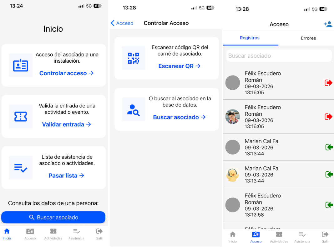 - Funcionamiento: Tras iniciar sesión y seleccionar la entidad, utiliza la cámara del dispositivo para escanear el QR o realiza una búsqueda manual del asociado mediante el icono de la lupa.