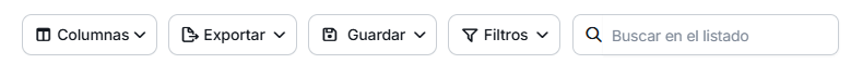 Todos los listados tienen un menú para poder configurar los campos visibles de forma personalizada, aplicar filtros y exportar el listado a PDF o Excel.