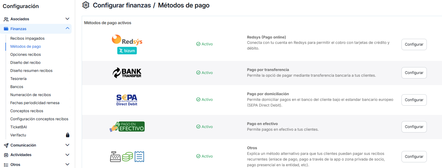 En este apartado verás los Métodos de pago que ya tienes configurados y los que puedes configurar: