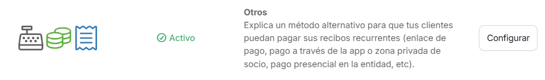 Activa el método de pago Otros cuando los métodos habituales no se adapten completamente a tus necesidades.