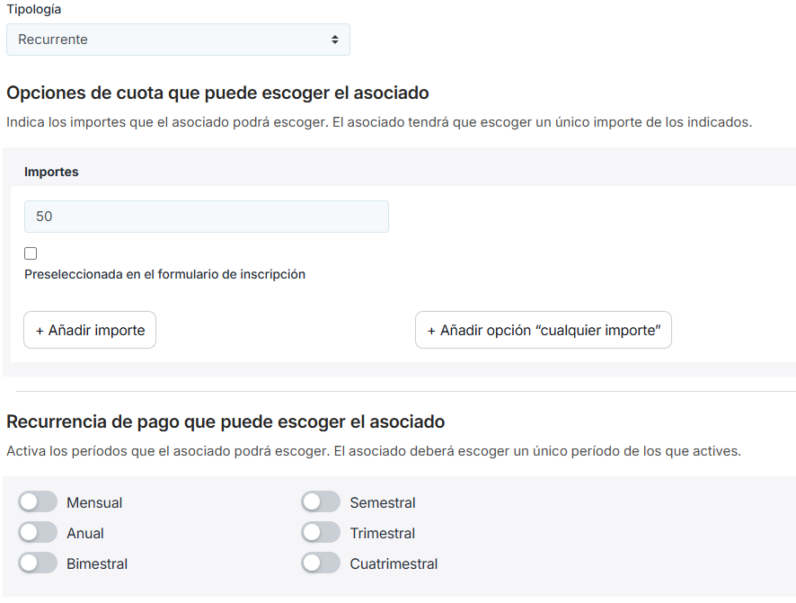 Una vez definidos los importes, selecciona la recurrencia de pago disponible (por ejemplo: mensual, trimestral, anual).