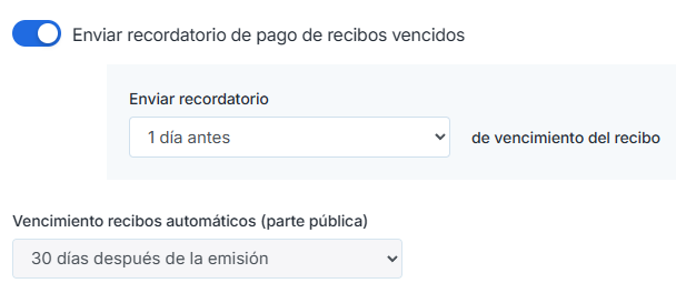 - Activar la opción Enviar recordatorio de pago de recibos vencidos.