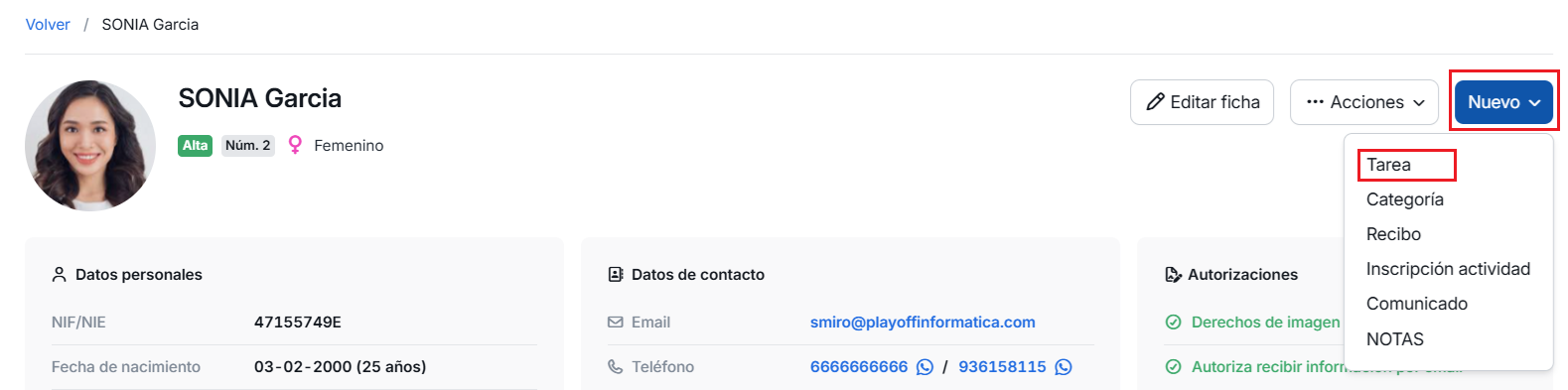 Una vez creada la tarea, puedes realizar diferentes gestiones desde el módulo o desde la ficha del asociado.