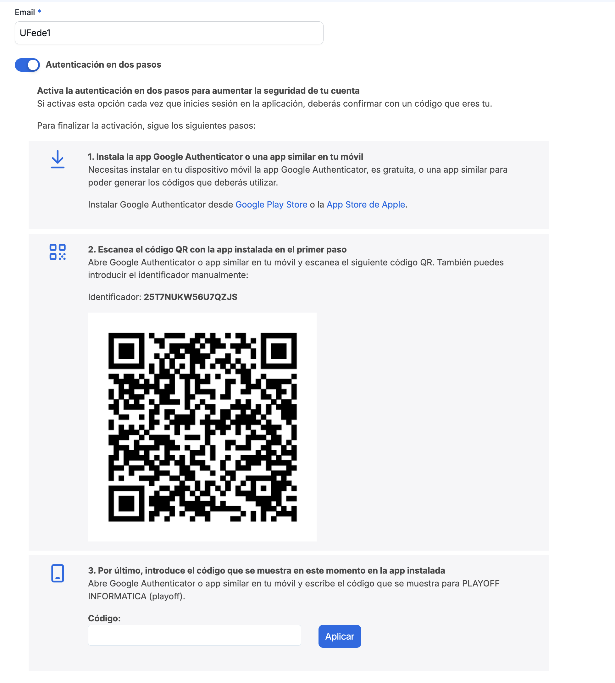 - Sigue las instrucciones que aparecerán para configurarla (deberás instalar una aplicación y escanear un código QR con tu aplicación de autenticación).