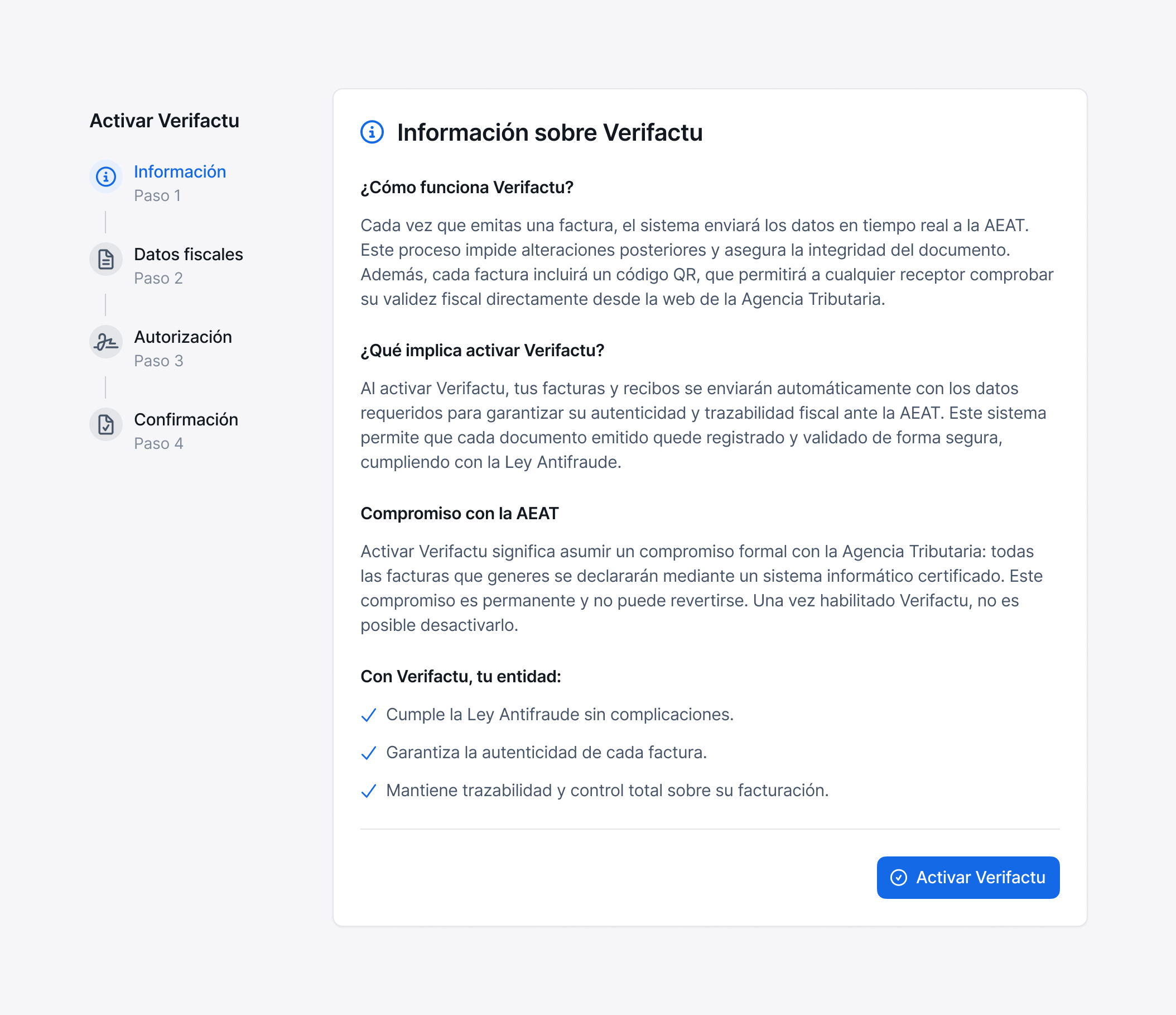 - Completa el formulario de VeriFactu. Se te solicitará realizar los siguientes pasos: